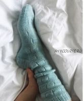 В тексте подробно разобран весь процесс вязания носка от соединения в круг до трикотажного шва. Текст дополнен фотографиями процесса, видео-подсказками и графической схемой узора.