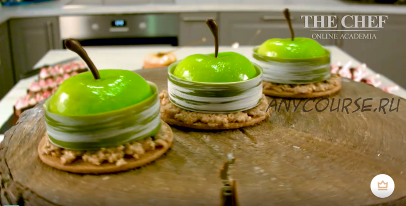 - Райские яблоки (бретонское фундучное сабле, хрустящий слой, запеченные яблоки в сидре, мусс зеленое яблоко, зеркальная глазурь и декор из шоколада)
