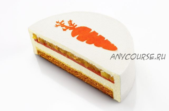 В состав торта входит влажный морковный кекс, нежное кремю со специями, дарящее тонкое послевкусие шафрана с гвоздикой, конфи из манго и моркови, манговое компоте, которое сложно удержаться и не съесть отдельно от торта, и пористый мусс на основе творожного сыра.