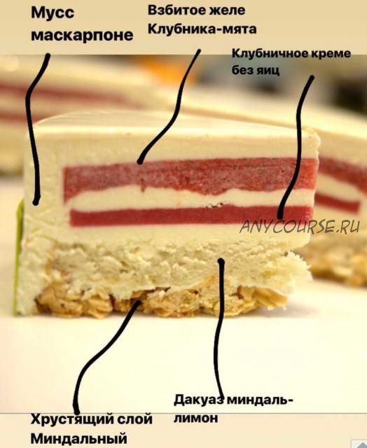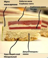 Миндальный бисквит, хрустящая прослойка, взбитое клубничное желе с мятой, кремю клубничное, мусс с маскарпоне