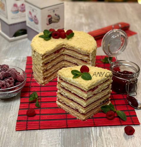 Этот торт напоминает вкуснейшее печенье «Курабье». За счёт крема на основе сливок и белого шоколада каждый его кусочек просто тает во рту. А приятная малиновая кислинка придаёт торту особую изюминку.