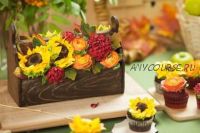 - Вы научитесь собирать и выравнивать прямоугольный торт, художественно стилизовать кремовое покрытие под фактуру дерева, создадите яркую цветочную композицию из крема.