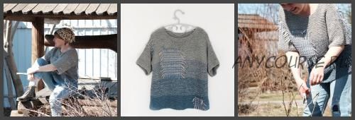 Джемпер выполняется в три нити со сменой цветов. Корпус – снизу вверх, рукава – от проймы вниз. Джемпер декорирован вышитыми «заплатами» из ленточной пряжи.