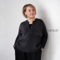 Джемпер свободного кроя с застежкой «поло» и круглой стойкой. Выполнен снизу вверх переплетением 'резинка' и 'лицевая гладь'. Пройма прямая, рукав с небольшим окатом, с расширением. Уютный джемпер засчет свободной посадки и приятного состава. Комфортное, стабильное полотно.