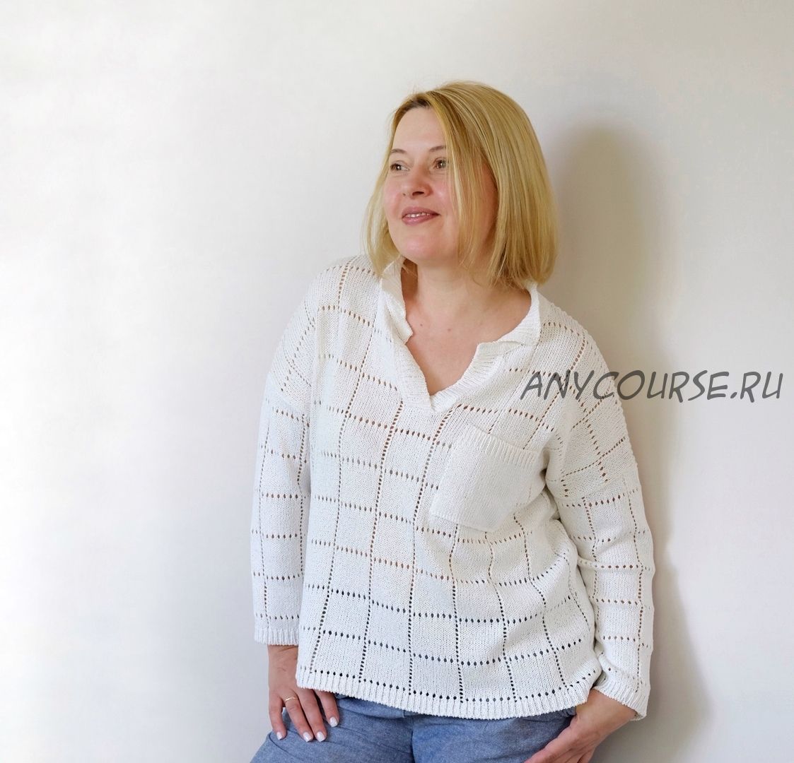 Рубашка выполнена ажурным рисунком «клетка», с арочным низом, пройма прямая, рукав 3/4, с небольшим окатом. Воротник выполнен на стойке, застежка «поло» оформлена планками. На спинке отрезная кокетка, спинка со складкой по центру.