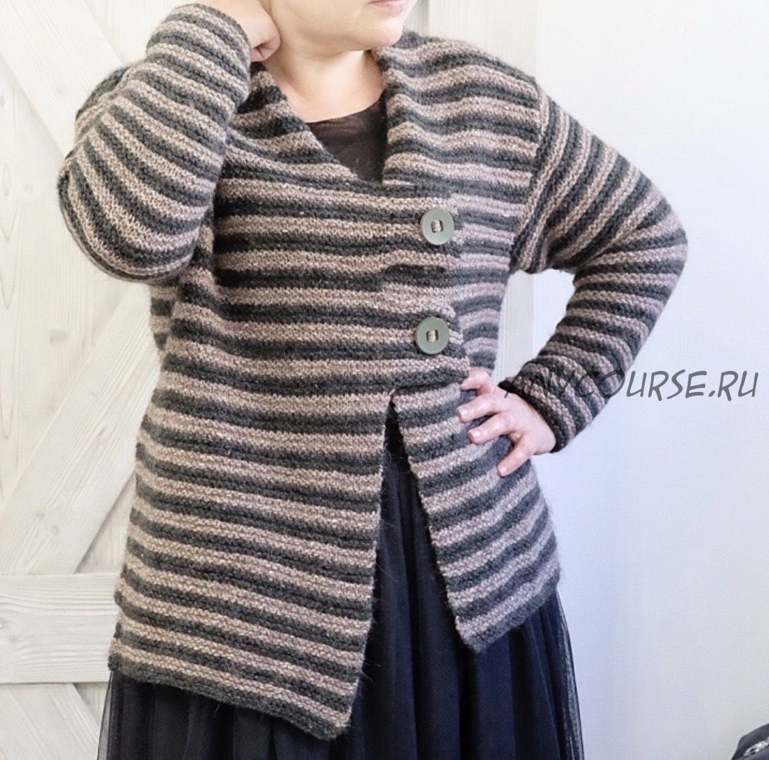 Жакет с втачным рукавом, немного заниженная линия плеча. Выполняется снизу вверх оттедльными деталями, платочной вязкой, с чередованием нитей двух цветов. Хорошо драпируется и садится по фигуре. Застежка навесная, на две пуговицы. Воротник цельновязанный с отворотом-стойкой по спинке. Одна полочка немного длиннее другой, что создает интересный визуальной баланс разной длины и выступающей застежки.