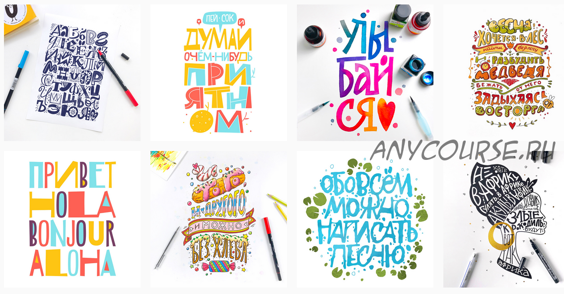 На протяжении курса будет масса практической работы по созданию открыток, плакатов, шрифтовых иллюстраций в разных стилях.