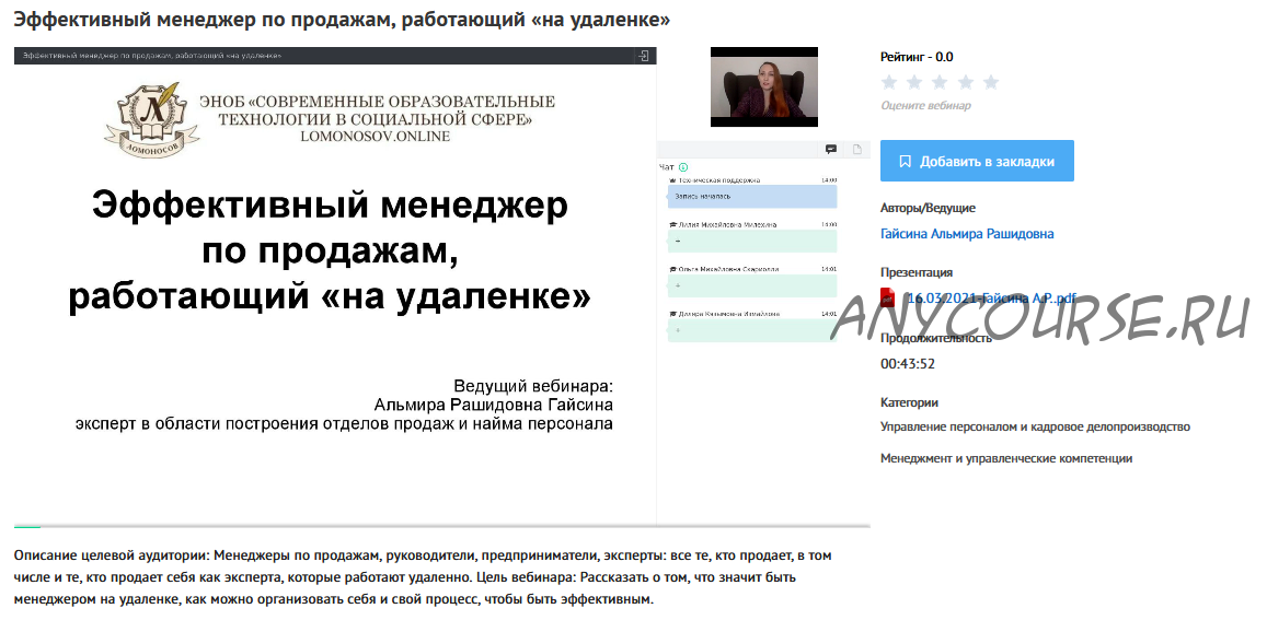 - [УИПКиП] Вебинар 'Эффективный менеджер по продажам, работающий «на удаленке»' (Альмира Гайсина)