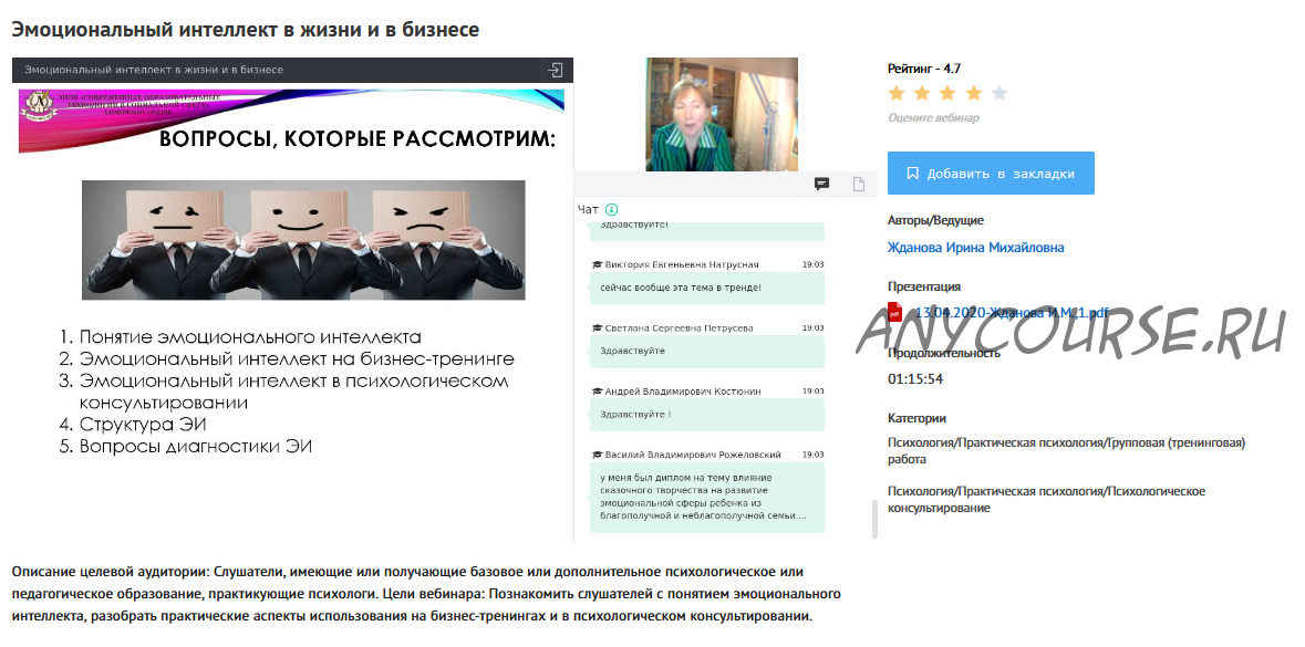 Описание целевой аудитории: Слушатели, имеющие или получающие базовое или дополнительное психологическое или педагогическое образование, практикующие психологи.