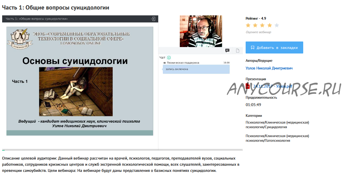 Описание целевой аудитории: Данный вебинар рассчитан на врачей, психологов, педагогов, преподавателей вузов, социальных работников, сотрудников кризисных центров и служб экстренной психологической помощи, всех слушателей, заинтересованных в превенции самоубийств.