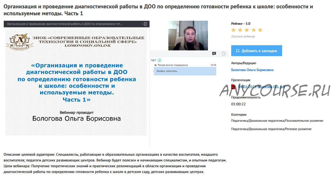 - [УИПКиП] Вебинары 'Организация и проведение диагностической работы в ДОО по определению готовности ребенка к школе' (Ольга Бологова)