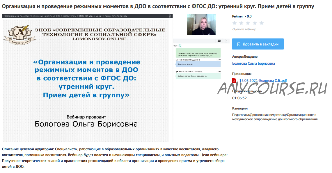 - [УИПКиП] Вебинары 'Организация и проведение режимных моментов в ДОО в соответствии с ФГОС ДО' (Ольга Бологова)