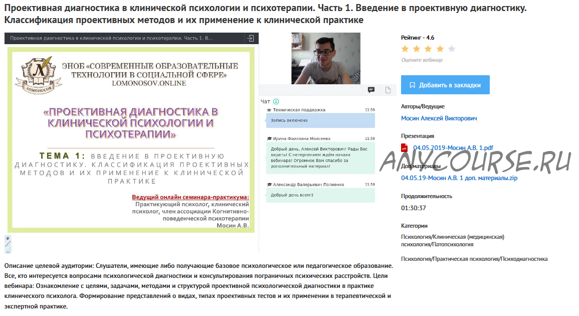 - [УИПКиП] Вебинары 'Проективная диагностика в клинической психологии и психотерапии' (Алексей Мосин)