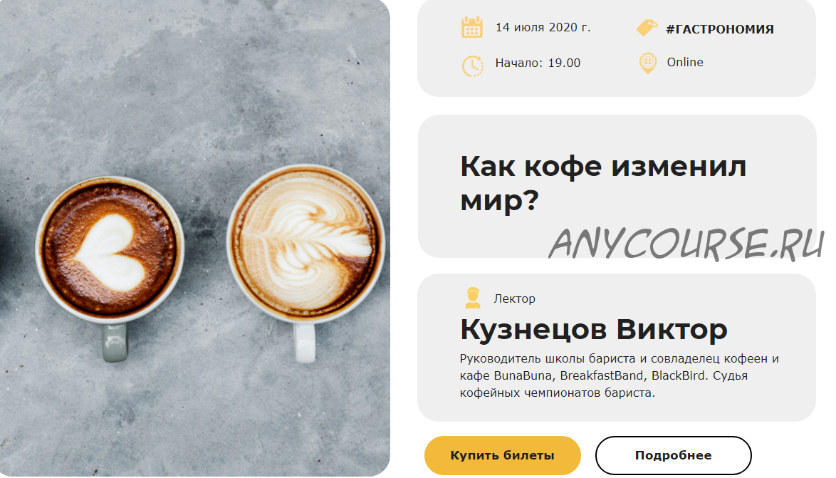 Вместе с Виктором Кузнецовым – руководителем школы бариста «БунаКофе», обжарщиком, судьей кофейных чемпионатов и чемпионом по приготовлению кофе в джезве - мы погрузимся в исторические коллизии становления ведущих кофейных регионов мира и ботаническое разнообразие кофейного дерева.