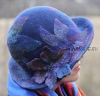 Такая шляпа идеально сидит на голове. При этом в процессе создания такой шляпы нет ничего сложного. На мастер-классе мы сделаем шляпку 'Полночный сад', темно-синего насыщенного цвета. Рисунок мерцающих цветов расположен по всей шляпе. Один цветок свалян отдельно и украшает поля. Его серединка вышита бисером. Так же бисером вышита серединка соседнего цветка - одного из нарисованных на шляпе. Рисунок многоцветный, с блеском и фактурой. Но при этом он не контрастирует с фоном, он не яркий. По вашей задумке можно сделать классическую строгую шляпу или кокетливую со сложным декором.