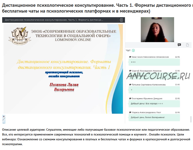 - Вебинары 'Дистанционное психологическое консультирование' (Лилия Полякова)