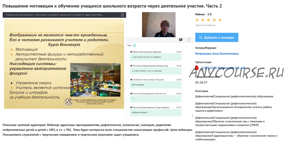 - Вебинары 'Повышение мотивации к обучению учащихся школьного возраста через деятельное участие' (Анна Вепринцева)
