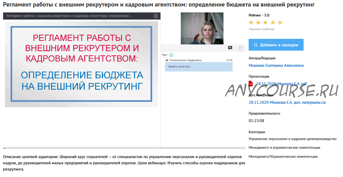 - Вебинары 'Регламент работы с внешним рекрутером и кадровым агентством' (Екатерина Мешкова)