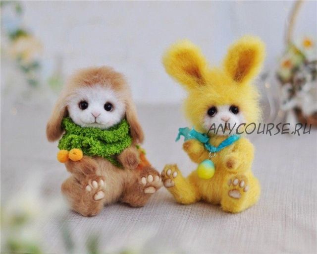 Оба зайчика связаны по одной схеме, разница только в пряже. Желтый зайка связан из пряжи Alize kid mohair, бежевый из бобинного итальянского кид мохера. Рост 12-13 см сидя без учета ушек.