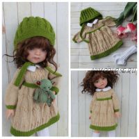 ? Комплект состоит из платья с двумя видами узоров, широким рукавом и воротничком, полностью распашное сзади, чепчика с узором 'колоски' и чулочек, связанных резинкой 2х2.