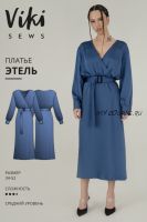 Выкройка платья умеренного объёма, приталенного силуэта. Верхняя часть переда из двух деталей на запах. На детали спинки плечевые вытачки. На деталях переда и спинки сборка по линии талии. Крой нижней части переда и спинки по косой. На нижней части спинки таллиевые вытачки. Линия талии зафиксирована эластичной тесьмой. Линия плеча расширена. Рукав длинный, рубашечный, умеренного объема. По низу рукава разрез, обработанный косой бейкой. Низ рукава собран на сборку и обработан притачной манжетой с застежкой на две петли и пуговицы. Вырез горловины глубокий, V-образной формы. У платья съёмный пояс с пряжкой. Длина изделия ниже середины икры.