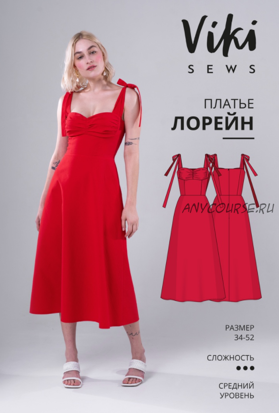 Выкройка платья малого объема, приталенного силуэта, с бретелями-завязками. Платье отрезное по линии талии. Верхняя часть переда с отрезным лифом, с драпировкой. Прилегание в верхней части переда и спинки создано за счет рельефов. Нижняя часть платья скроена по косой и имеет небольшое расклешение. Застежка платья на потайную молнию в среднем шве спинки. Длина платья до середины икр.
