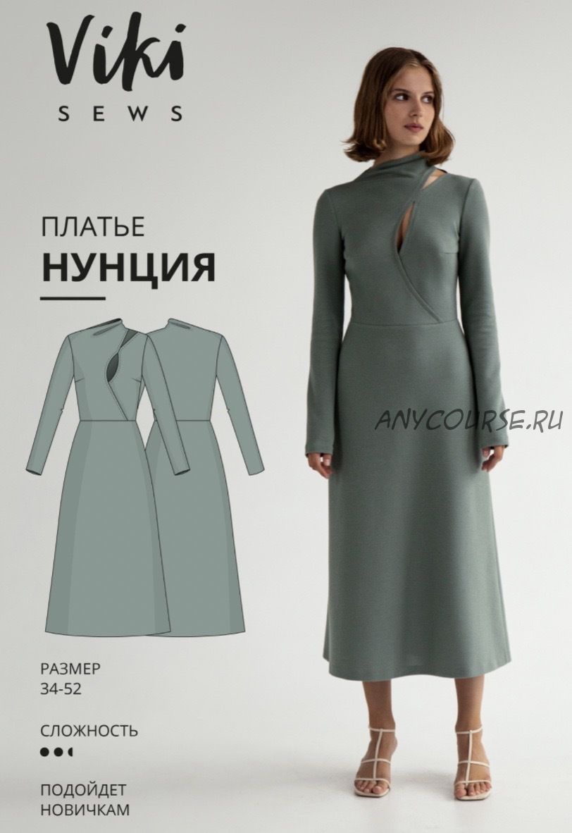 Выкройка платья малого объема, прилегающего силуэта. Платье отрезное по линии талии. Нижняя часть платья расширена книзу. Верхняя часть переда выполнена из двух деталей, создающих асимметричный разрез, переходящий на левое плечо. Горловина платья – асимметричная цельнокроеная стойка. На левом плече складка. Рукава длинные, втачные, малого объема. Длина платья ниже колен.