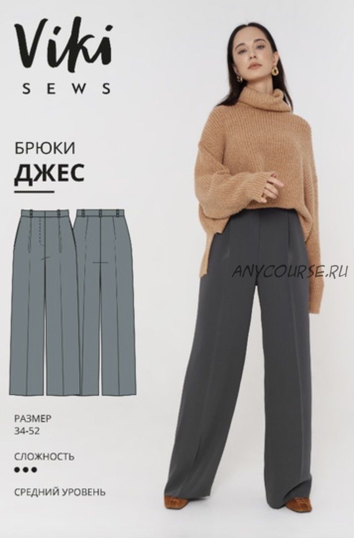 Брюки прямые, объемные, с заутюженными стрелками на передней и задней половинках, с высокой линией талии. На передних половинках мягкие складки, на задних – талиевые вытачки. Длина с учетом обуви на высоком каблуке. Пояс притачной со шлевками, который застегивается на крючок и петлю. В боковых швах внутренние карманы. Застежка-гульфик на молнию.