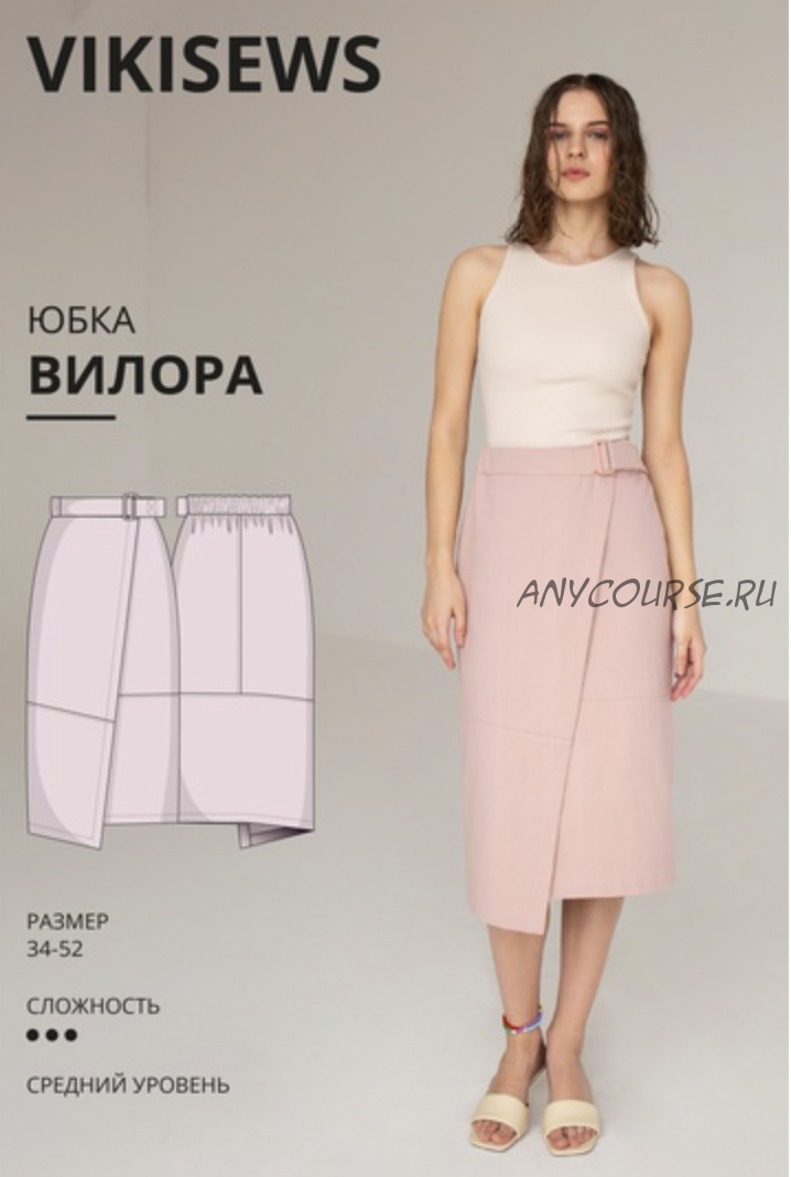 ? Выкройка юбки умеренного объема, прямого силуэта, на запахе. Ниже линии бедер юбка имеет асимметричный горизонтальный подрез по переднему и заднему полотнищу. Заднее полотнище юбки содержит средний шов в верхней части. Асимметрию юбки подчеркивает наклон правого борта и удлинение к центру от бокового шва. Пояс юбки притачной. В задней части пояса вставлена эластичная тесьма (резинка). На передней левой части пояса имеется отлетная деталь, которая продевается через пряжку, фиксируя пояс по талии. Верхний край пояса находится на естественной линии талии. Застежка юбки на тесьму велкро. По линии среднего шва заднего полотнища, линии подреза, краю борта и низа изделия проложены отделочные строчки.