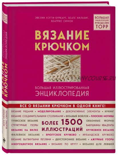Все, что вам нужно знать о вязании крючком! Эта большая энциклопедия совмещает в себе и учебник, и справочник, и прекрасно подходит как для начинающих, так и для опытных вязальщиц. Начиная с первой петли и базовых техник вязания крючком до узоров и специальных методов, книга станет вашим незаменимым компаньоном, который и научит и даст совет в трудную минуту. В энциклопедию включены и оригинальные техники, такие как тунисское вязание, ирландское вязание, вязание на вилке, а также самые актуальные тренды: ажурное вязание, нукинг, модульное вязание. 1500 иллюстраций демонстрируют каждый шаг, связанный с вязанием крючком. А в качестве бонуса - полный набор справочной информации, список условных сокращений, 100 часто задаваемых вопросов и все, что понадобиться, чтобы продавать свои изделия в Интернете. Кто любит вязать крючком, полюбит эту книгу!
