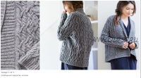Кардиган выполняется отдельными деталями снизу вверх, которые затем сшиваются. Петли для воротника поднимаются по краям полочек и горловины спинки. Воротник выполняется поворотными рядами. Для каждой детали представлена отдельная схема.