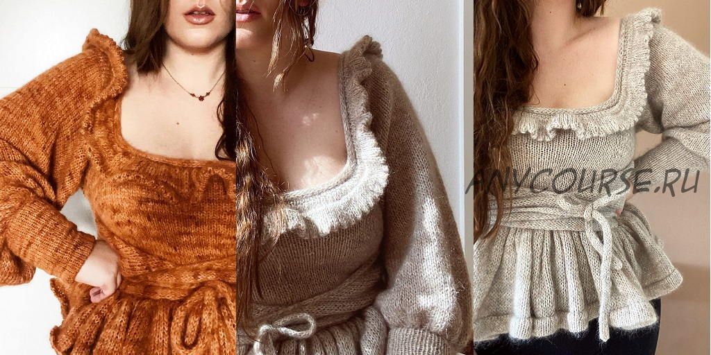 Объемный и рельефный силуэт, пышные рукава, оборки и драпированная баска придают блузе ностальгический вид. Дизайн дополнен квадратным вырезом горловины и высокими манжетами на рукавах, а приталенный лиф подчеркивается на талии тонкими шнурами. Длина тела (от плеч до нижнего края): 52 (54) 56 (58) 60 (62) 64 (66) см.