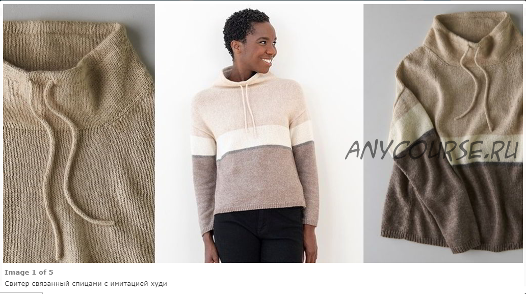 ? Сейчас в моде худи разных форматов. Дизайнер Джули Хувер предложила свою вариацию этого удобного свитера. Заниженная линия плеча здесь выступает декоративным элементом, привлекая внимание к плечу и постепенно переводя взгляд на ворот, имитацию сложенного капюшона худи. Ворот вяжется по кругу от горловины. Затем выполняется кулиска для шнурка и вторая половина ворота пришивается с внутренней стороны. Не менее важно в данном 'худи' добавление полос разной ширины, что подчеркивает стиль и актуальность свитера среди модных моделей.
