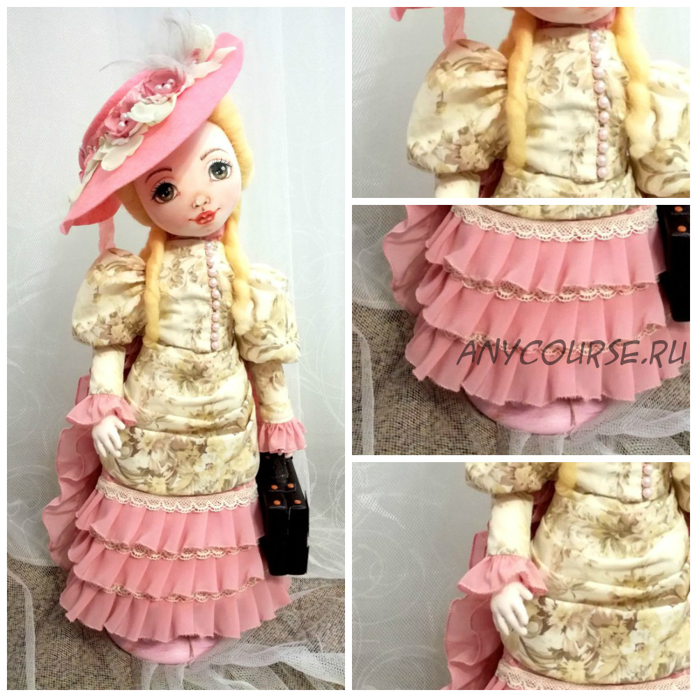 Приглашаем Вас сшить под руководством мастера любительницу путешествий по имени Элизабет. Ростом она 45 см. Кукла сделана с использованием интересных техник, одета в роскошный наряд и имеет аксессуары. За 4 занятия Вы получите такой же результат. P.S. Те, кто выберет тариф заботливый, дополнительно получат видеоурок по созданию чудной шляпки для Элиз*абет и чемодана, с которым она путешествует!