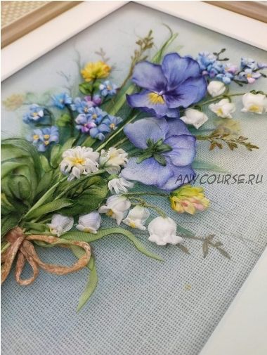 Онлайн-курс по вышивке лентами Нежного БУКЕТА, состоящего из анютиных глазок, незабудок и ландышей с листьями, охватывает широкий спектр базовых техник и художественных приемов, позволяющих создать но уникальную и эффектную работу.