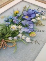 Вышитая лентами картина с НЕЖНЫМ БУКЕТОМ из анютиных глазок, незабудок, ландышей.
