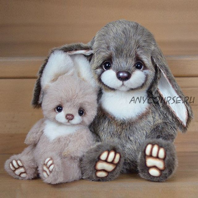 ? Вы получаете сразу две выкройки: для зайчика поменьше (25 см с ушками) и для зайчика побольше (35 см) + очень подробное (38 страниц) пошаговое описание процесса создания игрушки с использованием авторских приемов + несколько видеороликов, в которых показан процесс стрижки мордочки, лап, тонировки.