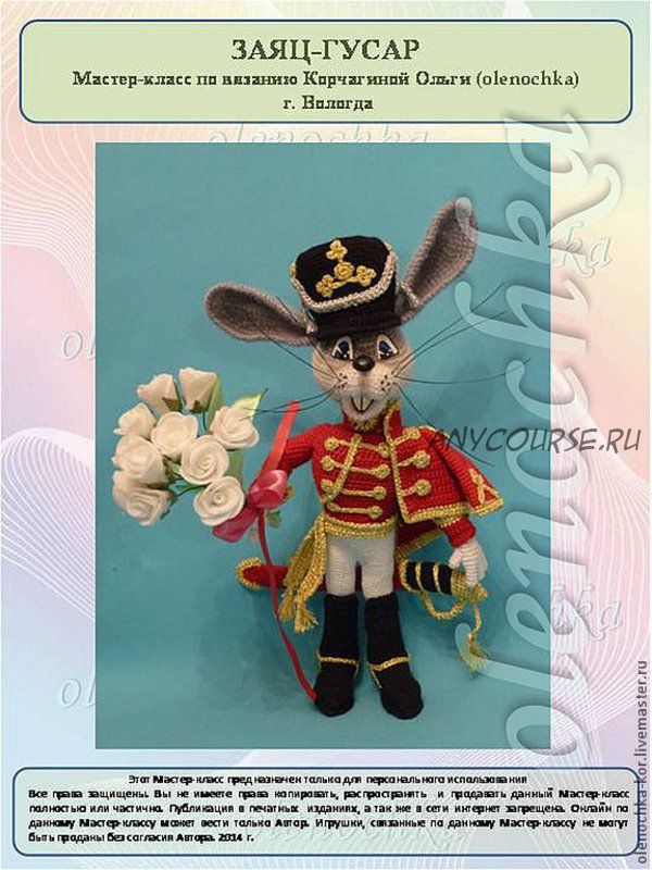 ? Зайка-Гусар, связанный по открытке, времен СССР будет отличный подарком к любому празднику. Кто из нас не мечтает о красавце мужчине, гусаре, да еще и с букетом цветов? Зайка на проволочном каркасе, глазки расписаны вручную акриловыми красками. Предлагаю Вам мастер-класс по вязанию крючком