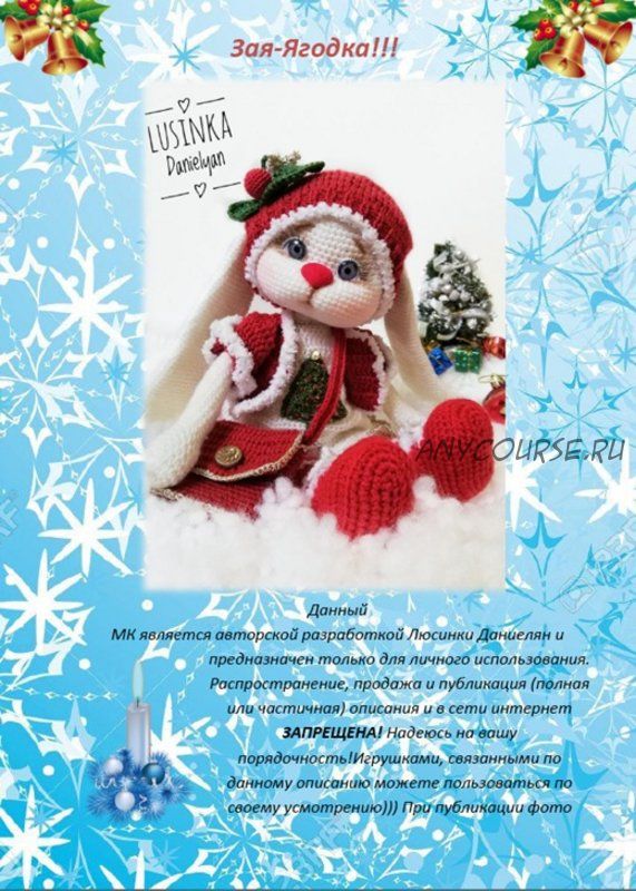 В мк входит подробное описание заюшки,а так же всей одежды: платьица,кофточки,башмачков,шапочки. Все,кроме шапочки связано крючком,шапочка-спицами. Мк сопровождается множеством поэтапных фото.