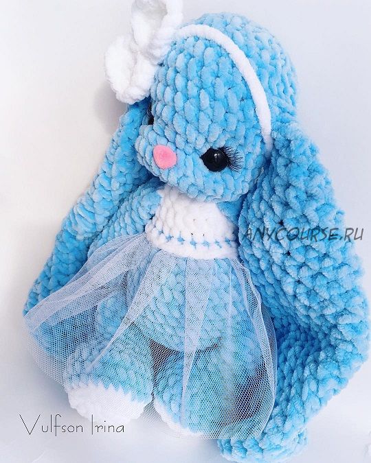 Рост зайки 35 см Выполнена из нежнейшей детской гипоаллергенной пряжи YarnArt Dolche Все лапки ввязаны, зайка самостоятельно сидит Ушки выполнены воздушным узором, 30 см.