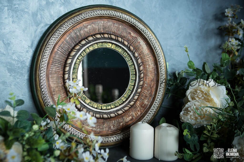 Элегантное винтажное зеркало в круглой раме. В этом мастер-классе сочетается множество техник. Здесь есть работа с пастой для лепки и кракелюр, многослойное окрашивание и патинирование. Большое внимание в уроке уделяется подбору цвета и нюансов при продумывании работы.