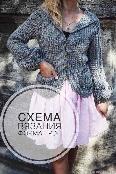 Женственный жакет с расширенными рукавами, воротничком и кармашками вы сможете связать крючком по авторской схеме в формате pdf