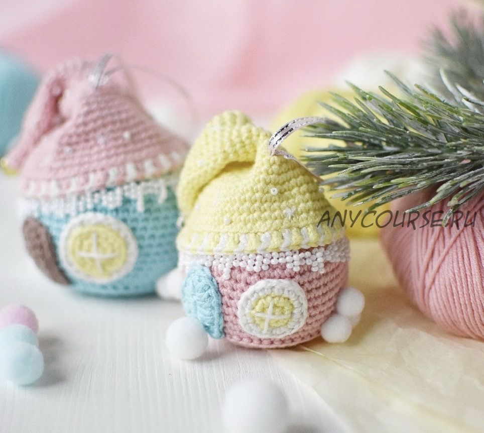 Мастер-класс 'Милые новогодние домики' содержит фото и видео вязания двух домиков разных размеров ( высотой 9 см и 6 см).