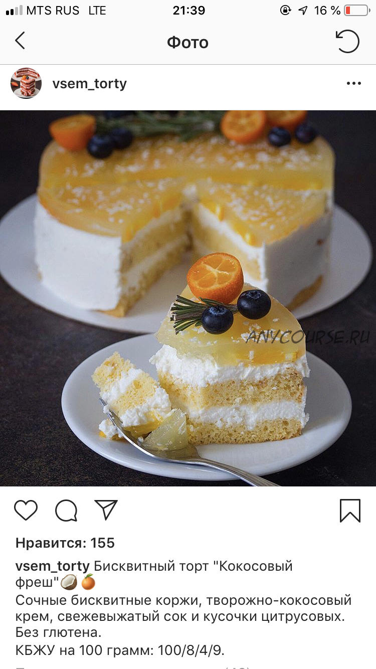 Сочные бисквитные коржи, творожно-кокосовый крем, свежевыжатый сок и кусочки цитрусовых. Без глютена.