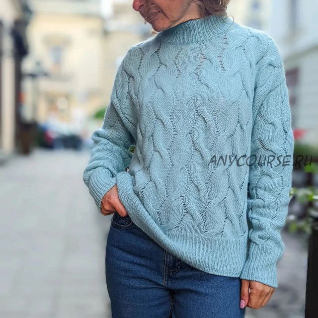 Свитер вяжется отдельными деталями и сшивается. Имеет спущенное плечо, разрезы, удлиненную спинку и узор, напоминающий волны нашего моря.