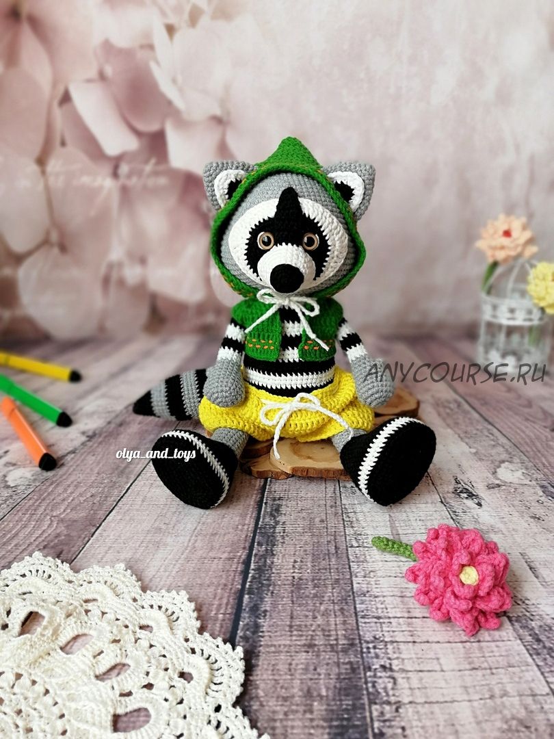 В МК входит описание самого енота и одежды к нему: шортики, берет, бабочка и жилетка с капюшоном.