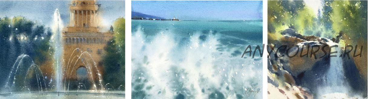 Брызги во все стороны, хаотичные блики, «барашки» на волнах, камни под водой и песок на дне. Да мало ли у природы интересных для художника образов. Вместе с Сергеем вы научитесь писать фонтаны, волны и водопады так, чтобы они не выглядели искусственными. А напротив - бежали прямо в акварели, шумели и сияли.