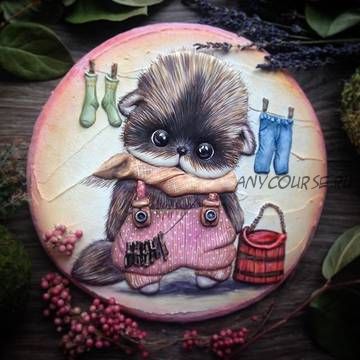 ? В работе чудесный пряничек (размер пряника 20см в диаметре) с енотиком в технике пайпинг, по мотивам рисунков Марины Лебедевой. Шерстка, ушки, пуговки, прищепочки и конечно глазки.