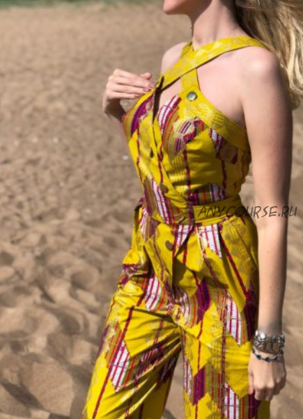 ? Комбинезон женский прилегающего силуэта, отрезной по линии талии, на притачных планках и бретелях, с запАхом, с застежкой на прорезные петли и пуговицы. Перед с двойными нагрудными вытачками. Брюки «бананы» с боковыми карманами. В комплект лекал (отдельным файлом) входит юбка «футляр», на замену брюкам.