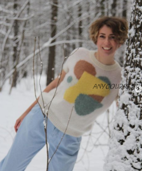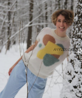 Жилет овер, со спущенным плечом, горловина оформлена ложной кеттлевкой, а проймы резинками, вывязанными укорочёнными рядами.